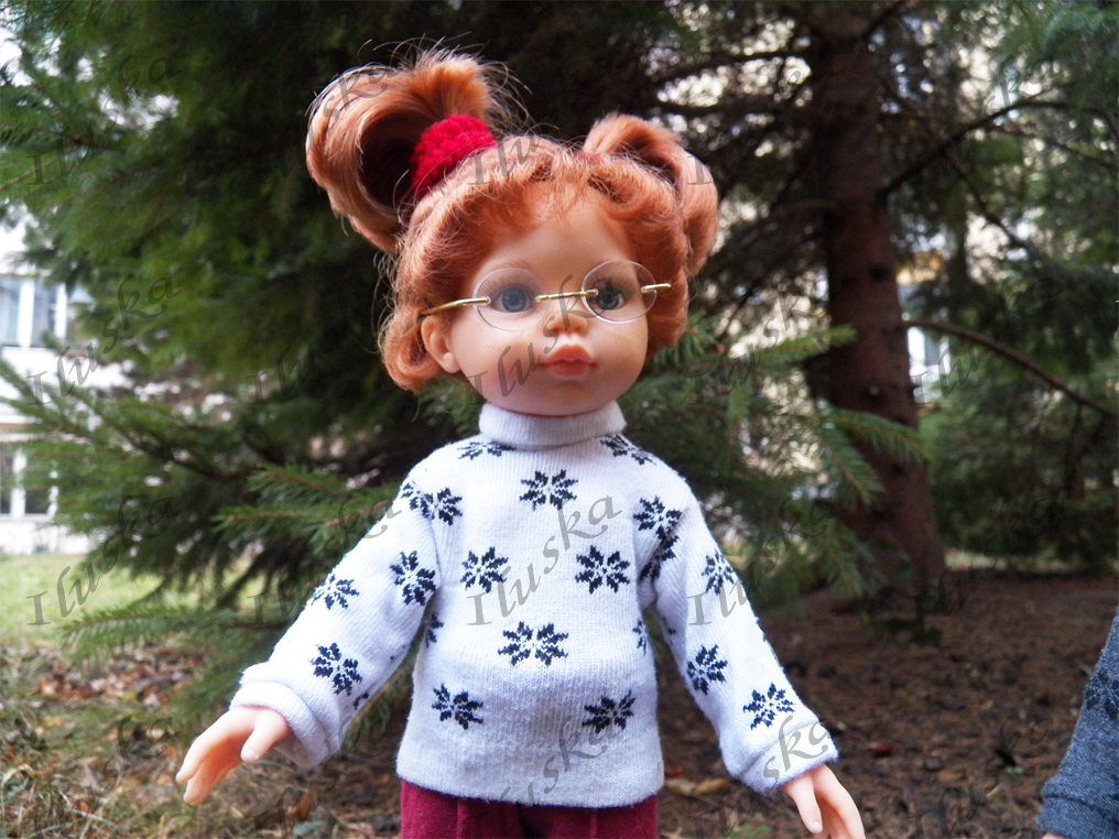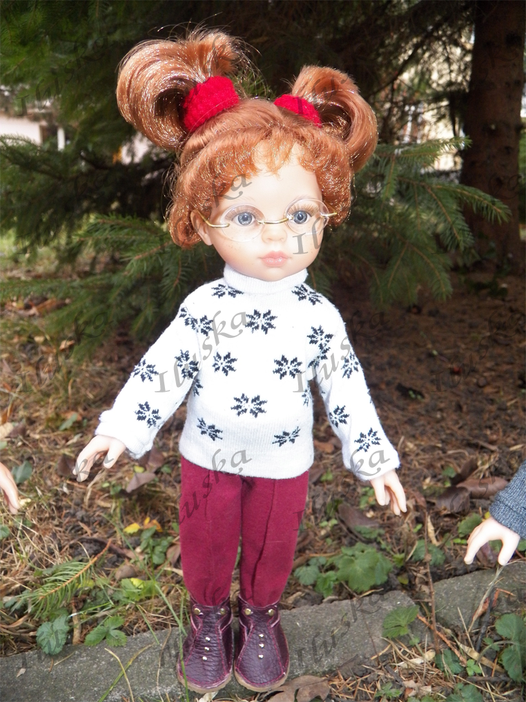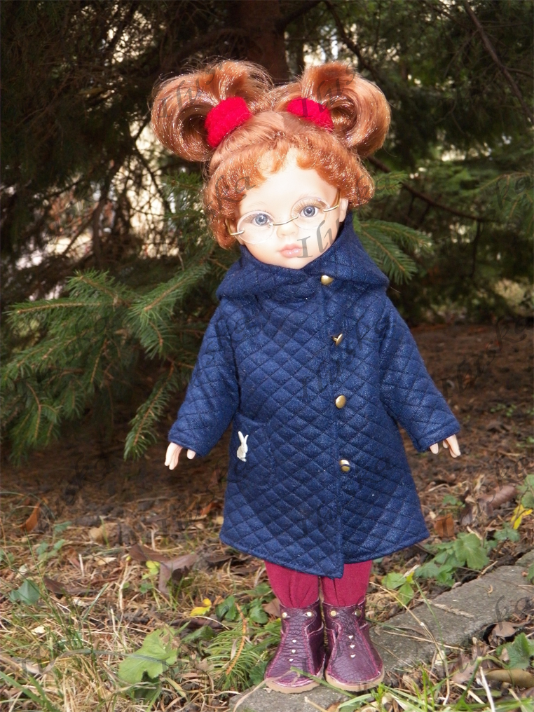 CristiCristi má na sobě kabátek s kapucí z nějaké "umělotiny", která svou strukturou budí dojem prošívání. Kromě ozdobných zlatých knoflíků má na kapse figurku bílého králíčka - scrapbooking. Klasické kamaše (včetně pásku pod chodidlem a prošití předních dílů nohavic) jsou z bavlněné látky. Ponožkový svetřík má rolákový límec a zapínání vzadu na zip. Botičky z kůže v barvě bordó jsou ručně šité. Zapínají se poněkud netradičně - na nýty. |